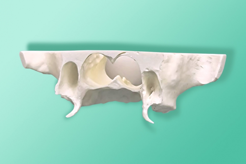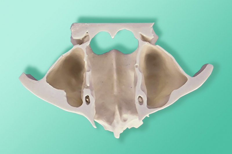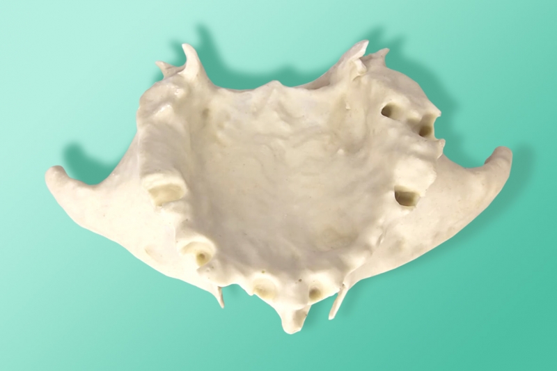 Edentulous model for training in pterygoid implantation, which is an alternative to sinus lift procedures. The model was developed based on an authentic clinical case, utilizing a patient's DICOM file from computed tomography scans. It is characterized by significant bone atrophy in the posterior maxilla and a limited amount of bone in the traditional implantation site. It faithfully reproduces the areas of the medial pterygoid plate and lateral pterygoid plate. The model also enables training in implantation in the vicinity of the nasal cavity. It also allows for levelling the height of the alveolar process before implantation.