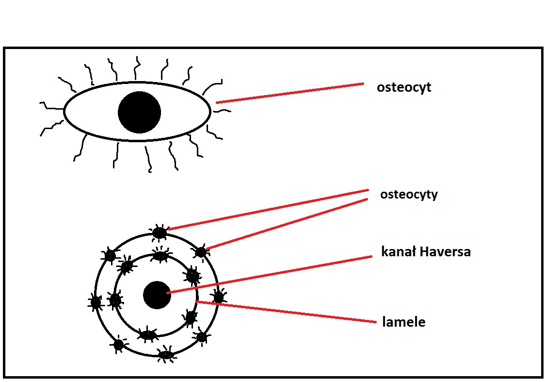 Rys . 5 Istota zbita. Osteocyt, kanał Harversa, blaszki kostne.